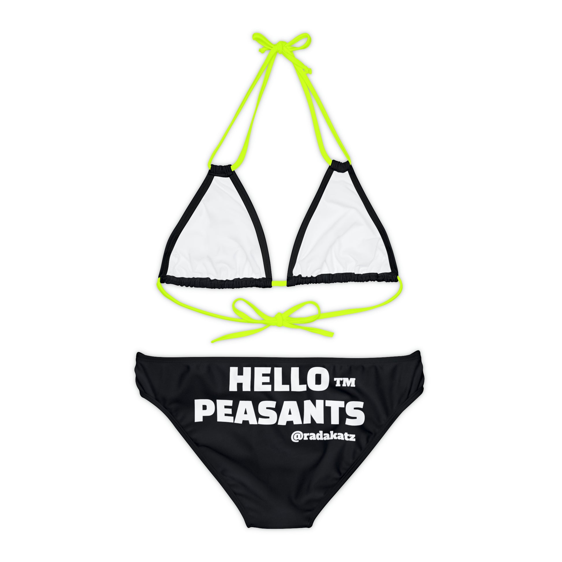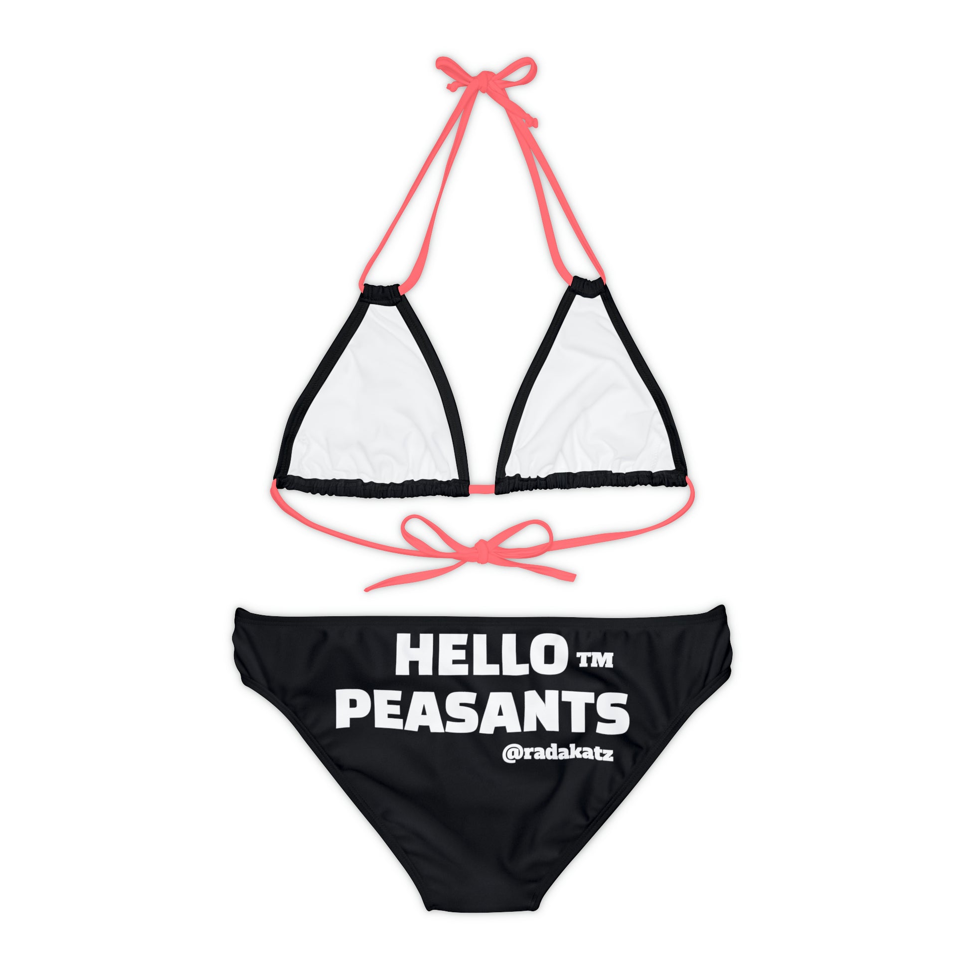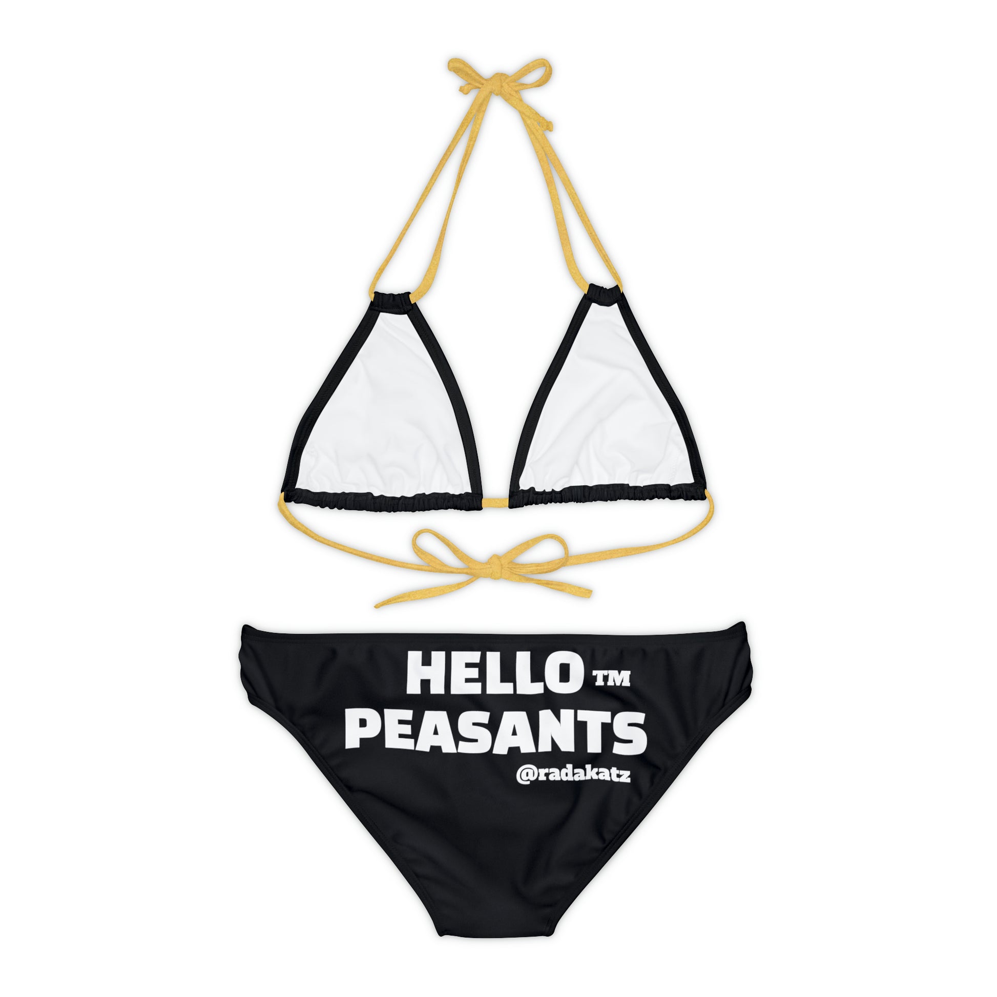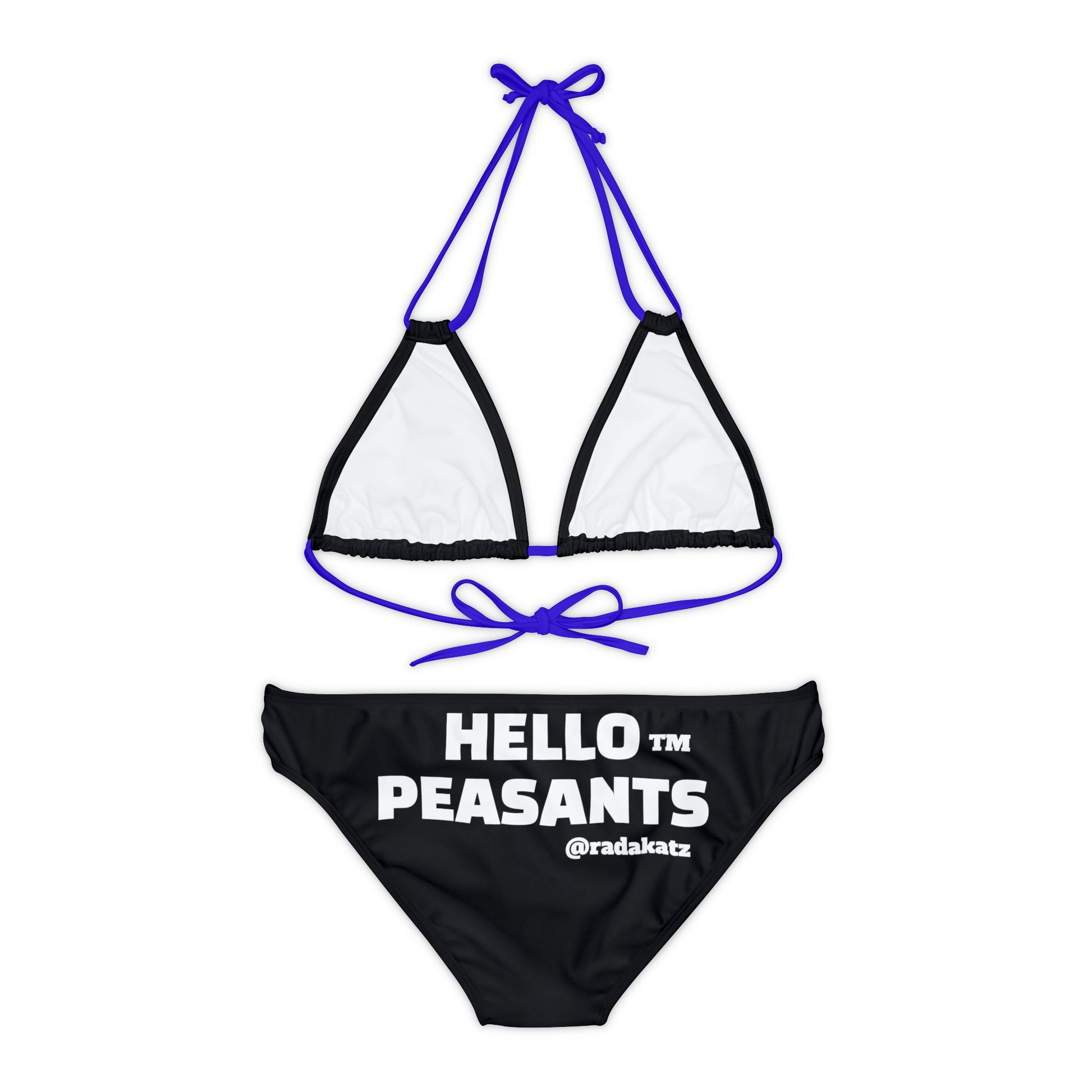 Designed by your favorite Socialite, Fashion Icon, Hermes Collector & Diamond Queen - RADA KATZ ™, this strappy bikini set is the perfect companion to all your Royal summer escapades. With adjustable elastic straps for a perfect fit, this HELLO PEASANTS ™ swimsuit will be an instant favorite!