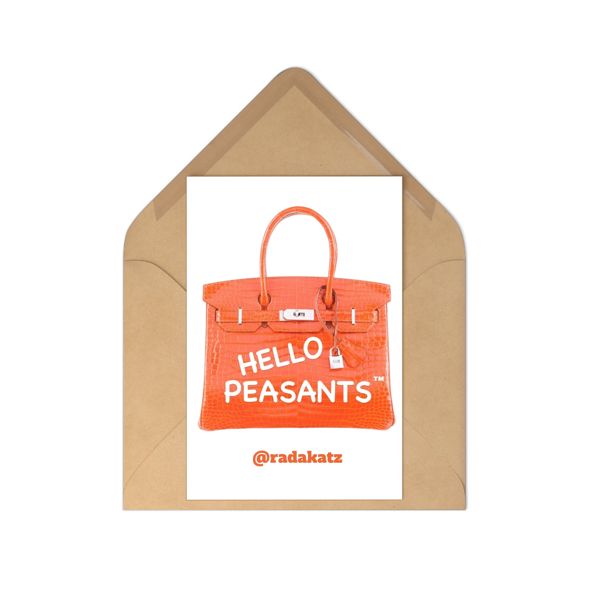Let someone know they are a PEASANT with this 7-piece postcard set. These Rda Katz Postcards are fabulous and come in white with an orange Birkin printes in matte finish. Chic craft paper envelopes are included to make it easier to send them while you continue your Royal adventures around the world.